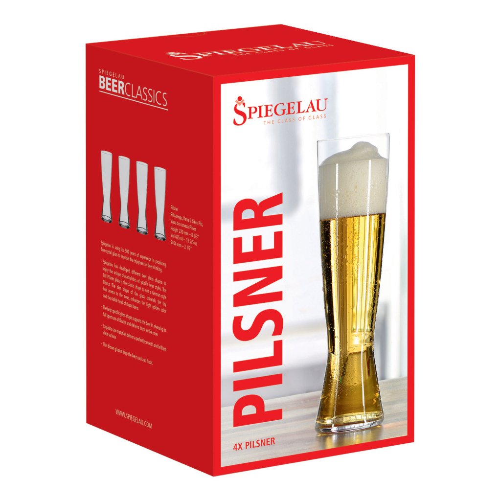 Das Pilsner Bierglas aus der Serie Beer Classics, Spiegelau ist für Biere vom Typ Pilsner konzipiert. Es handelt sich um helle, untergärige Biere von leuchtend goldener Farbe, die nach dem ursprünglichen Pilsner Rezept von 1842 gebraut werden. Sie finden sie unter den Bezeichnungen Pilsner, Pils oder Pilsner. Sie machen etwa zwei Drittel der Weltproduktion an hellen Bieren aus und unterscheiden sich von anderen Lagerbieren durch ihr ausgeprägteres Hopfenaroma und ihre angenehme Bitterkeit. Sie enthalten in der Regel 4 bis 5,5 % Alkohol.