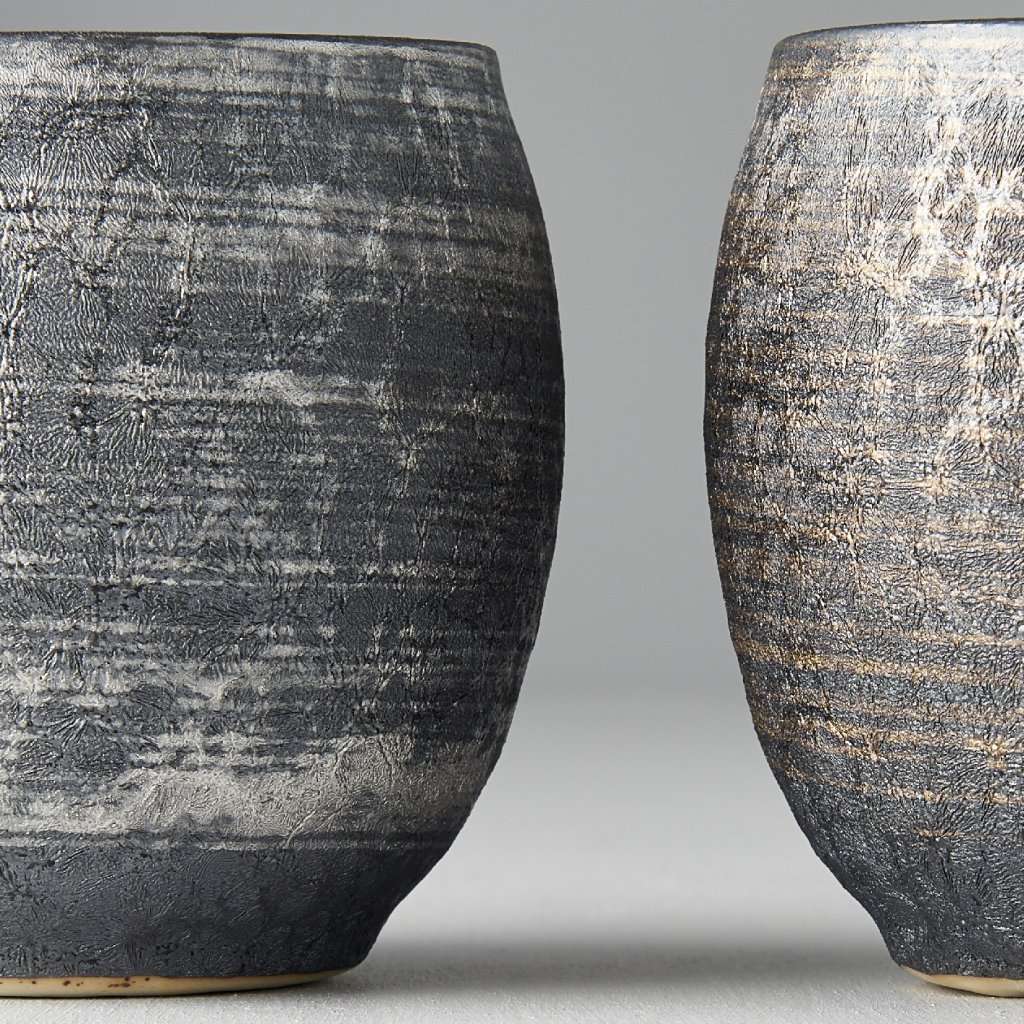 Kleine originelle Sho-chu-Tassen für traditionellen japanischen Sake (Reiswein) oder Tee. Jedes Stück hat eine schöne Oberfläche, die zwei Farben kombiniert. Eine Tasse hat eine dunkelgraue Farbe mit Silbertönen, die andere hat Bronzetöne. Die Tassen werden in einer eleganten schwarzen Schachtelgeliefert.