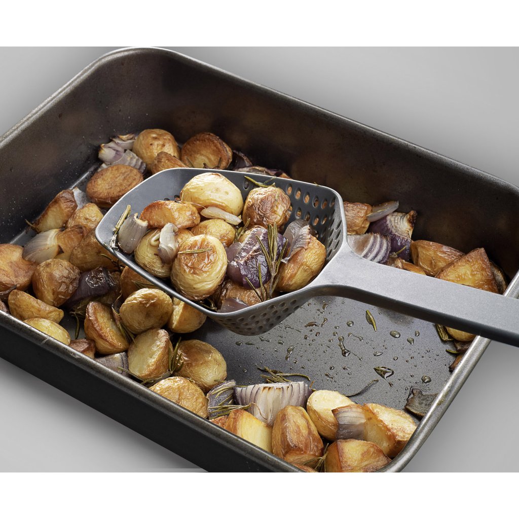 Wenn das Sieb und der Abstieg die Führung übernehmen, ist das oft ein akrobatischer Balanceakt. Die Designer hatten daher die Idee, die Rolle des Siebs umzukehren und einen sperrigen, gelochten Löffel zu entwerfen, mit dem man Nudeln und andere Zutaten direkt aus der Flüssigkeit schöpfen kann. Da es sich um ein wirklich einzigartiges Gerät handelt, wäre es schade, nur einen Topf zu verwenden - mit dem Löffel können Sie zum Beispiel gegrilltes Gemüse vom Backblech schöpfen. Außerdem müssen Sie nicht auf das Abtropfen warten, denn die Barriere am Boden ermöglicht es Ihnen, die Utensilien überall auf den Rand des Topfes oder der Pfanne zu legen.