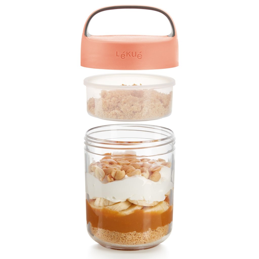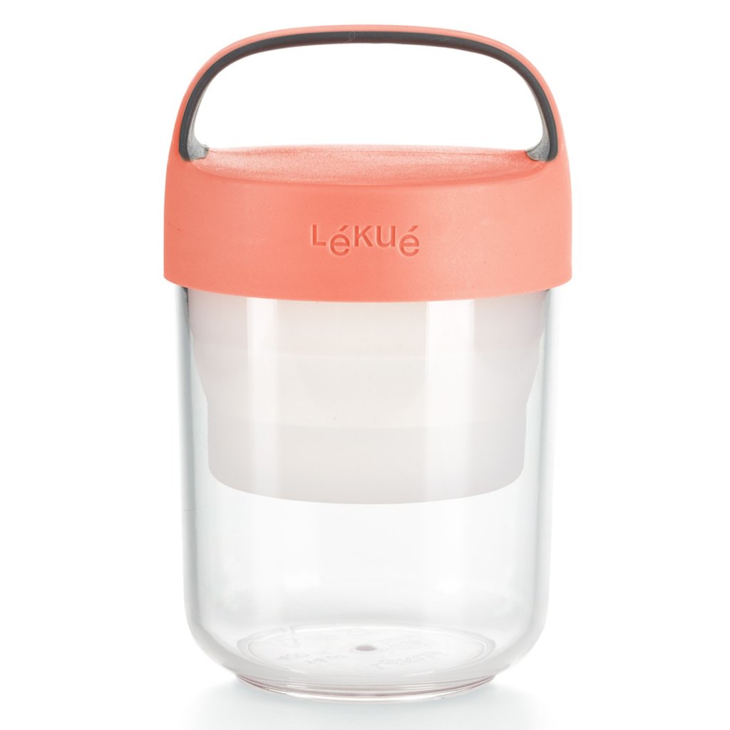 Die Snack-Box JAR TO GO von Lékué im praktischen und frischen Design besteht aus zwei Teilen - einem transparenten Lebensmittelbehälter mit einem Volumen von 400 ml und einem Becher aus Silikon, den Sie je nach Bedarf vergrößern oder verkleinern können. Die beiden Teile verschließen sich perfekt, so dass sich die einzelnen Köstlichkeiten nicht miteinander vermischen. In diesem Lebensmittelbehälter können Sie sowohl feste Zutaten als auch Flüssigkeiten wie verschiedene Dips, Soßen, oder auch Suppen sicher mitnehmen. Sie müssen sich keine Sorgen machen, dass etwas verschüttet wird, denn das Glas ist 100% auslaufsicher. Die Schraubkappe verfügt über einen angenehmen Griff für einfaches und bequemes Tragen.