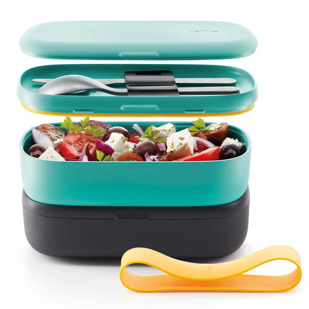 Diese elegante Lebensmittelbehälter für Snacks oder Mittagsessen besteht aus zwei hermetisch verschlossenen Behältern mit einem Volumen von 500 ml. Jeder hat einen eigenen Deckel mit Silikondichtung und Ventil, so dass der Inhalt immer luftdicht und auslaufsicher ist. Überdies gibt es unter dem Deckel eine Ablagefläche für Besteck - wie praktisch!