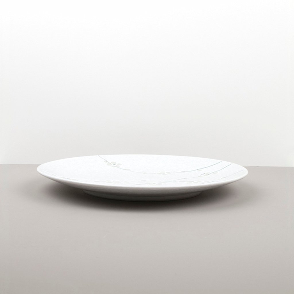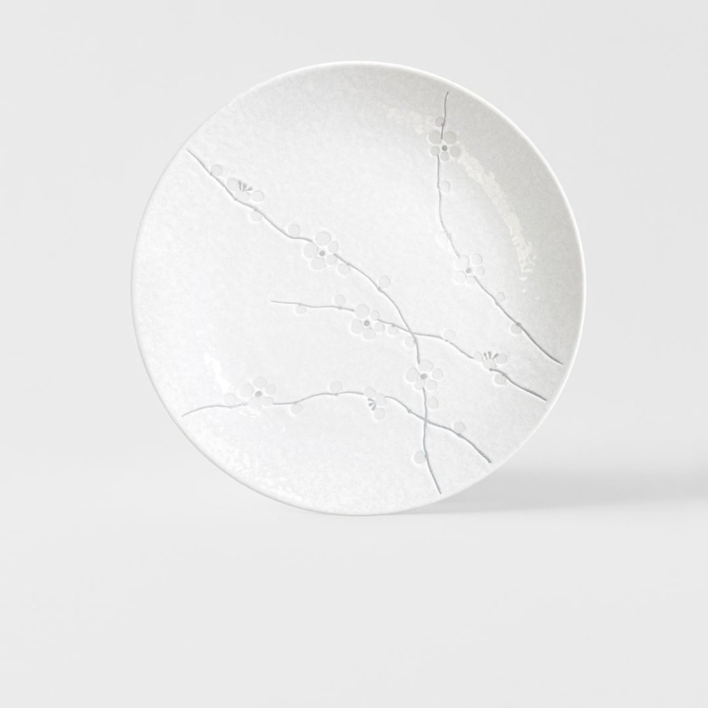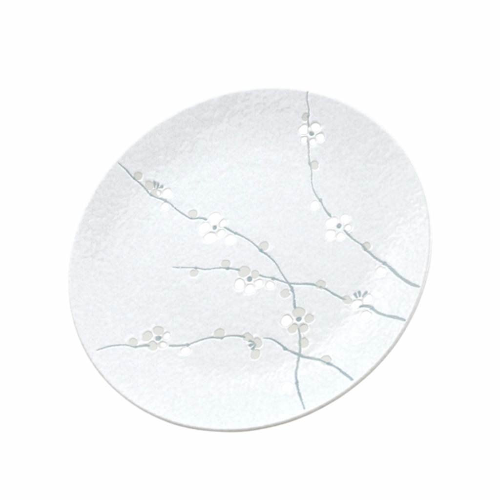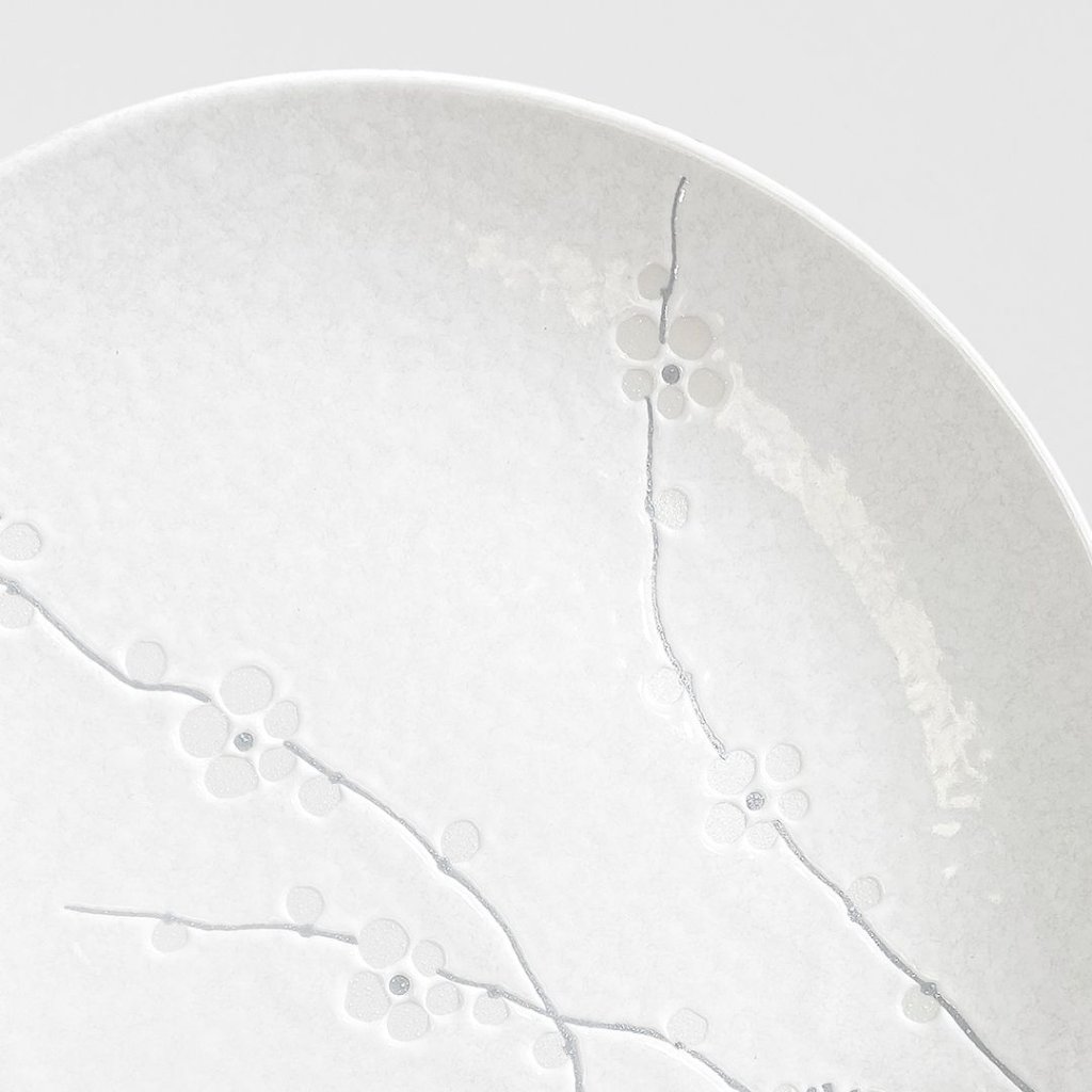 - Zart geprägte Pflaumenblütenmotive verleihen dem Teller Poesie und erinnern an die japanische Tradition, die Natur in ihren feinsten Details zu bewundern.