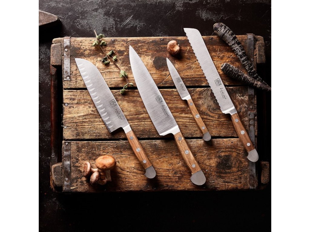 - ergonomisch geformter Griff aus Eichenholz mit drei Nieten und markanter Oberfläche für jederzeit sicheres Arbeiten