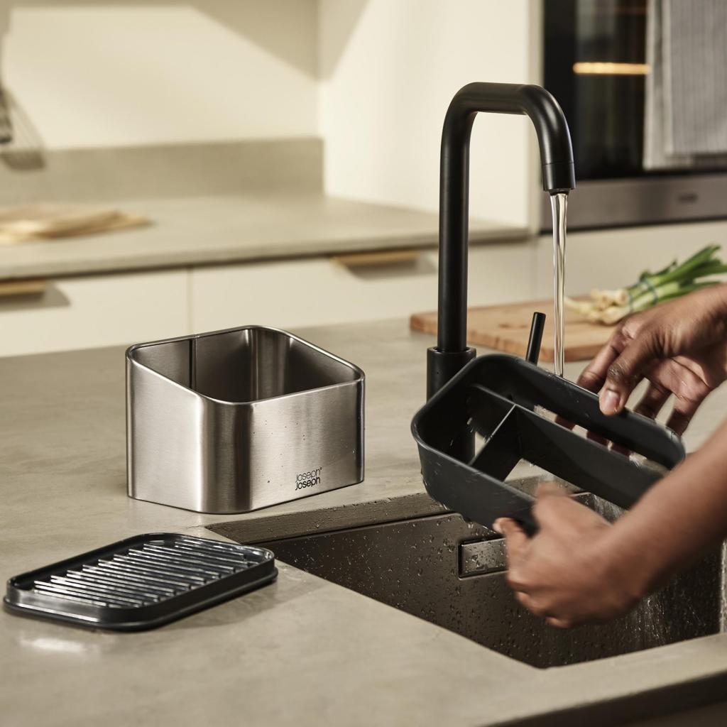 Es gibt Zeiten, in denen man sich am Spülbecken wie in einem kleinen Labor voller Schwämme, Bürsten und Flaschen fühlt, die sich gegenseitig im Weg stehen. Dieser Organizer aus Edelstahl verleiht ihnen klare Ordnung und trennt die einzelnen Hilfsmittel so, dass jedes seinen Platz hat. Anstelle von Improvisation gibt es ein einfaches System, das jeden Tag funktioniert.