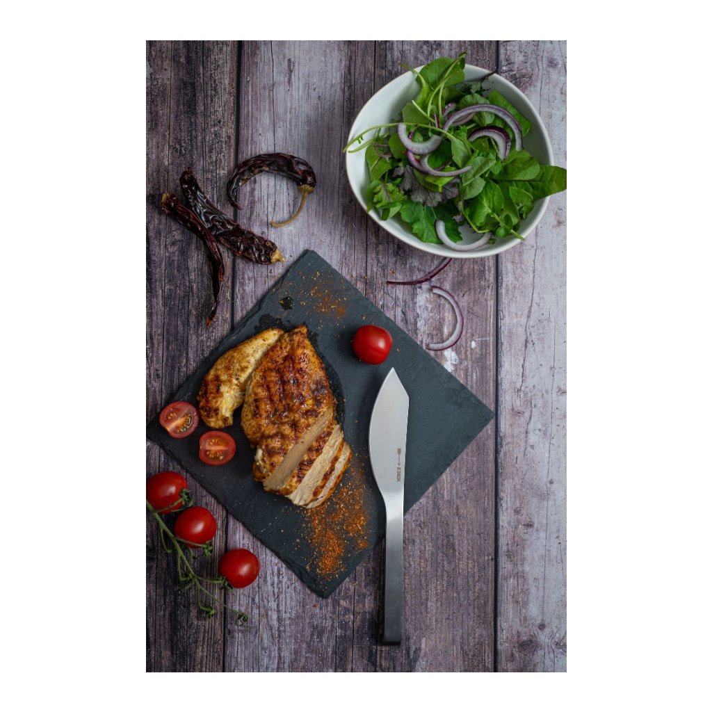 Die außergewöhnlich breite Klingenfläche, die glatte und schmale Schneide sowie die gebogene und superscharfe Schneide des AJAX-Messers garantieren einen sauberen Schnitt ohne Feilen oder Reißen, unabhängig vom Grad des Einstechens. Ein Schnitt mit der Klinge genügt, um das Fleisch zu zerteilen. Der Fleischsaft bleibt im Fleisch, die Fleischfasern werden nicht zerrissen und das Ergebnis ist ein unwiederholbares Geschmackserlebnis.