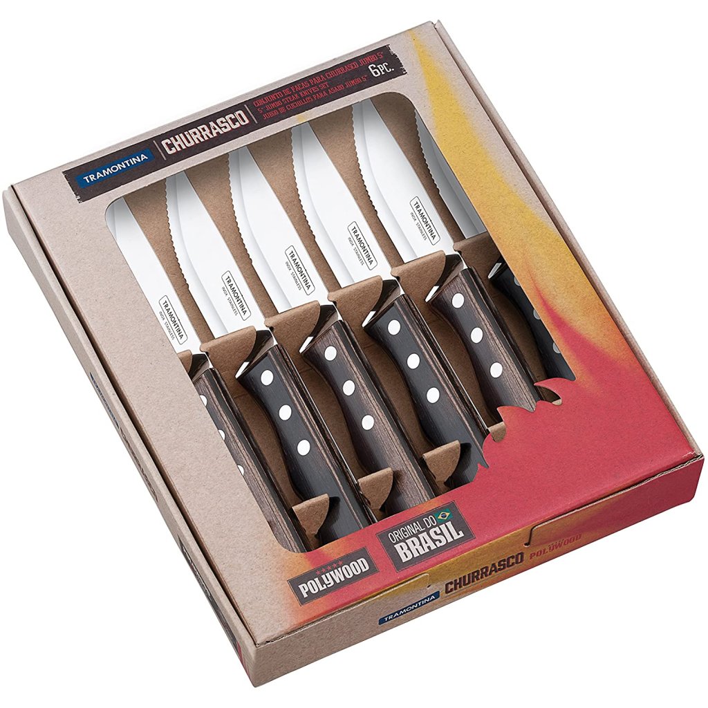 Mit dem sechsteiligen Jumbo-Steakmesser-Set von TRAMONTINA wird das Servieren von Gegrilltem zum Vergnügen. Sie haben harte Klingen aus rostfreiem Stahl. Die Griffe sind aus speziell präpariertem Holz gefertigt. Es wird hergestellt, indem mehrere Schichten Kiefernholz mit Harz imprägniert und dann fest gepresst werden. Die robusten Griffe sind hitze- und stoßbeständig und spülmaschinenfest. Die Messer werden in einer hübschen Geschenkbox geliefert, so dass Sie sie zum Jahrestag, zum Geburtstag, einfach so oder zur Hochzeit verschenken können.