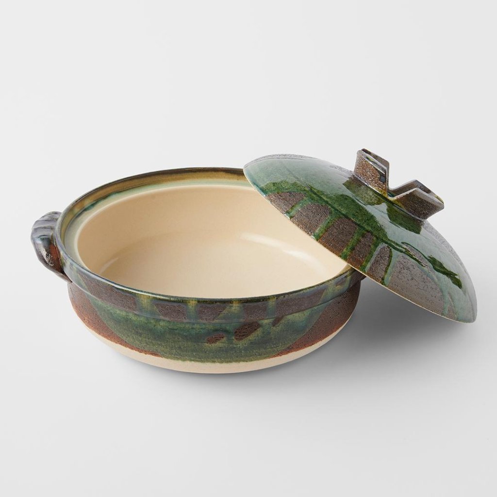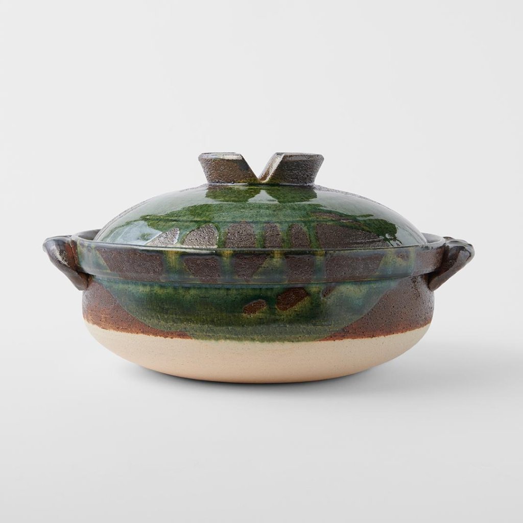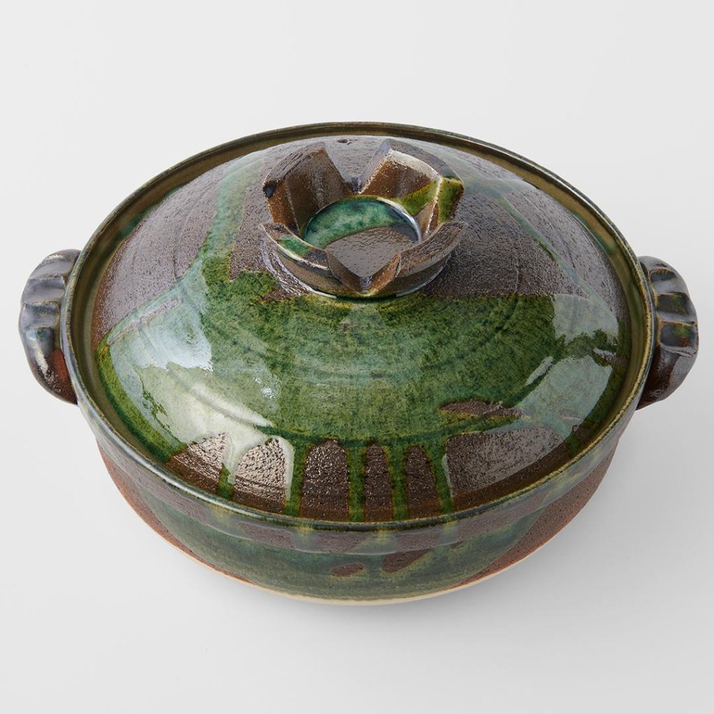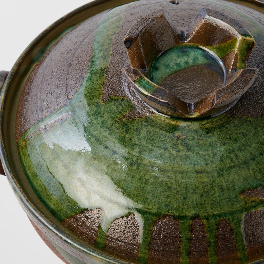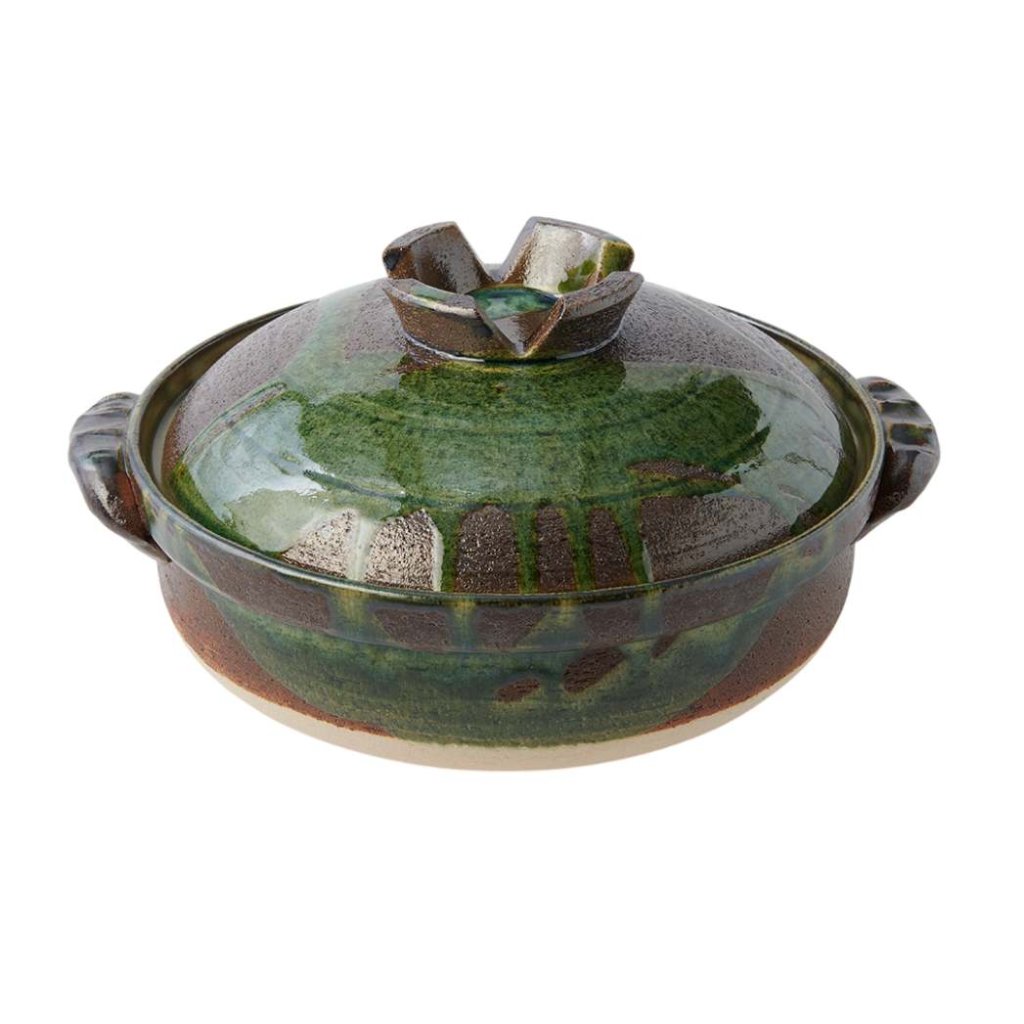 - Der Keramiktopf Topf DONABE mit einem Fassungsvermögen von 4 Litern in grünlich-braunem Design bringt die traditionelle japanische Art des Kochens auf den Tisch und fungiert dank seiner unverwechselbaren Form und handgefertigten Glasur als dominantes Element des Esstisches.
