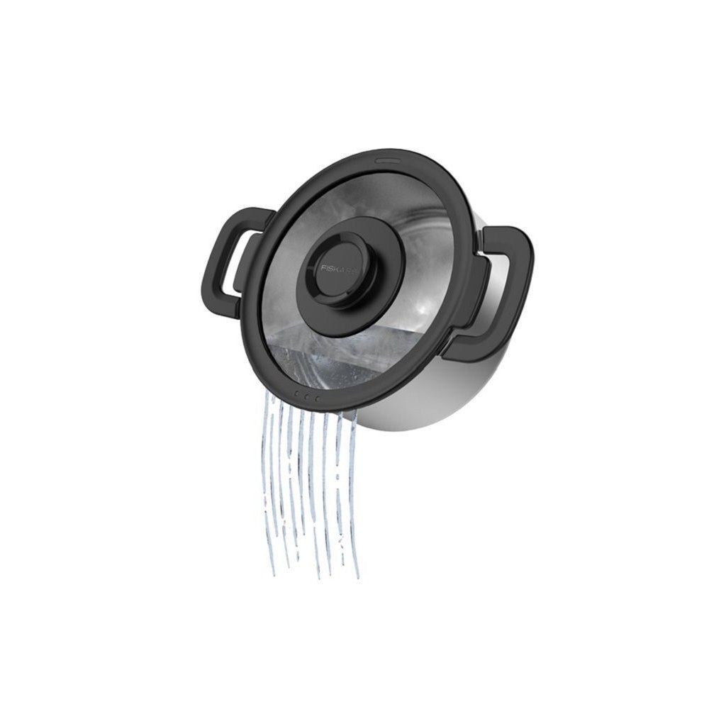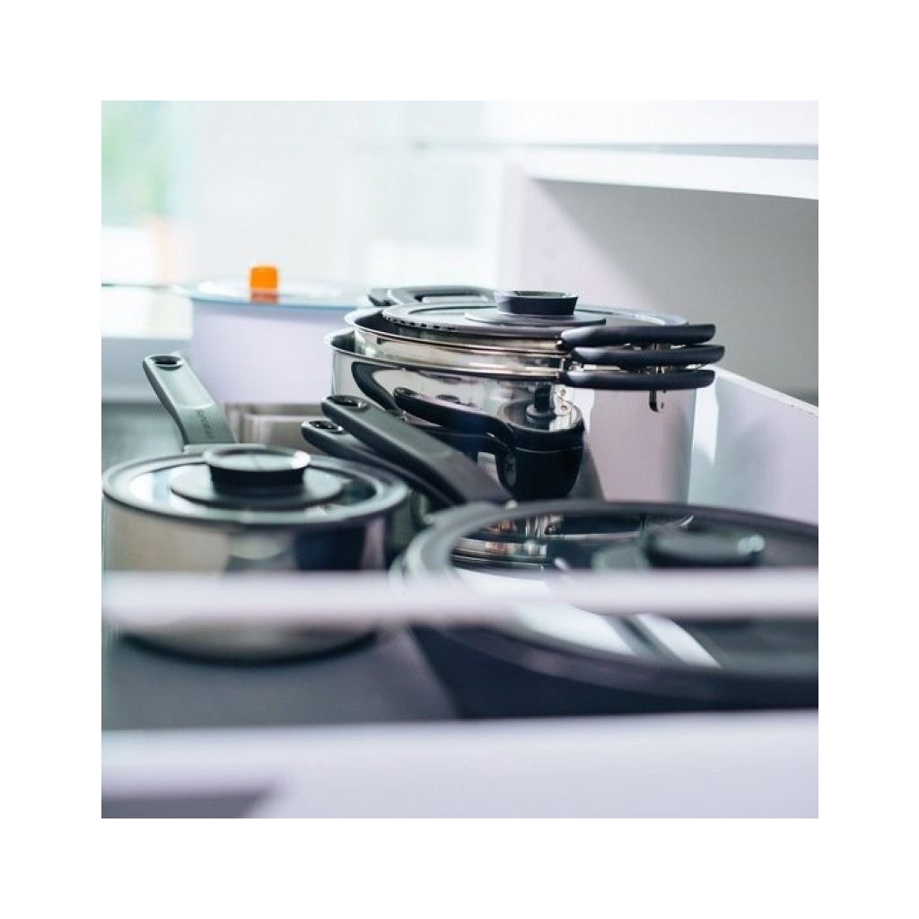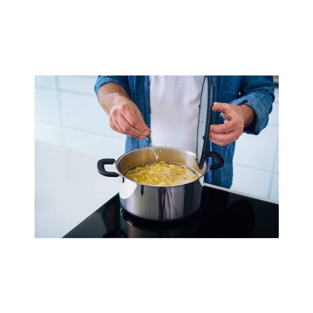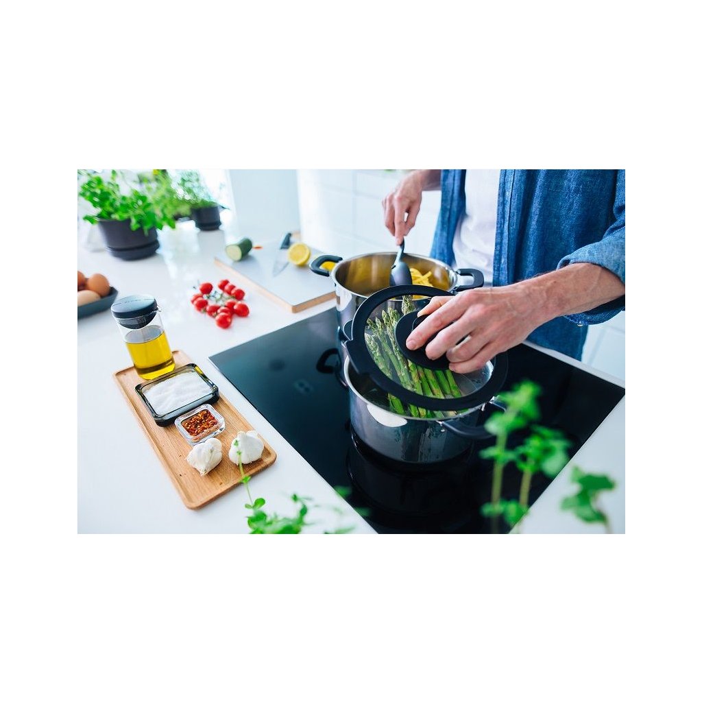 Die Außenfläche des Topfes ist glatt und bietet somit maximalen Schutz des Kochfeldes vor Kratzern. Der flache Glasdeckel aus gehärtetem Glas mit Silikonrand bietet zwei Möglichkeiten zum Ausgießen von Wasser und zur einfachen Überwachung der zubereiteten Speisen sowie zur Dampf- und Siedekontrolle. Der Topf lässt sich problemlos mit anderem Functional Form-Kochgeschirr stapeln und spart so Stauraum. Der Bakelitgriff bleibt beim Kochen angenehm kühl und sorgt für einen sicheren Griff.