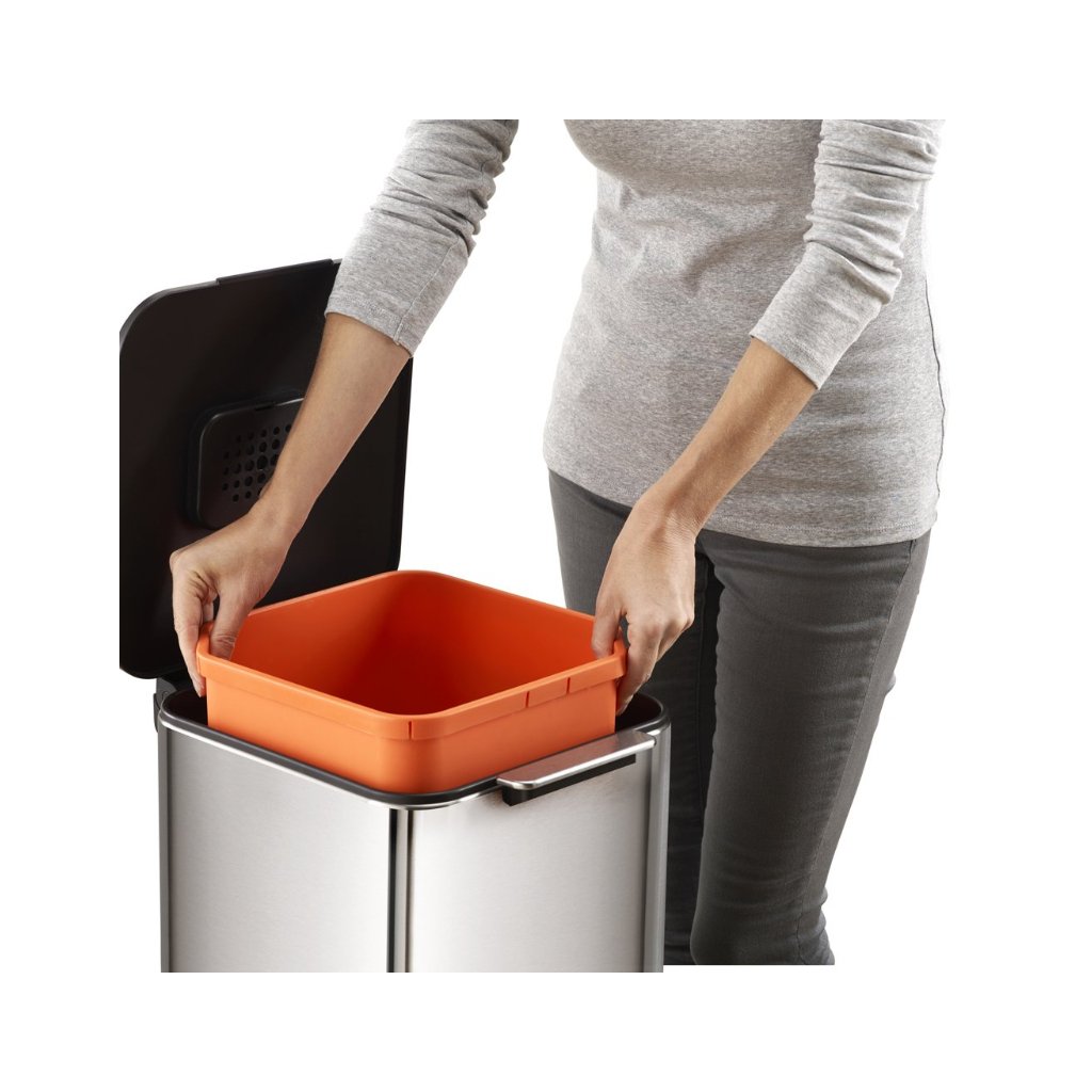 TOTEM MAX besteht aus 2 Behältern mit einem Fassungsvermögen von 20 + 20 Litern, die übereinander gestellt werden und den gleichen Platz wie ein klassischer Kücheneimer einnehmen. Die Kunststoffbehälter sind in einem Metallgehäuse untergebracht, und ihre Ränder sind so geformt und mit Rillen versehen, dass sich die Abfallsäcke leicht anbringen lassen. Sie können dann am Rand des oberen Korbes einen kleinen herausnehmbaren Behälter für organische Abfälle, d.h. Speisereste, anbringen.