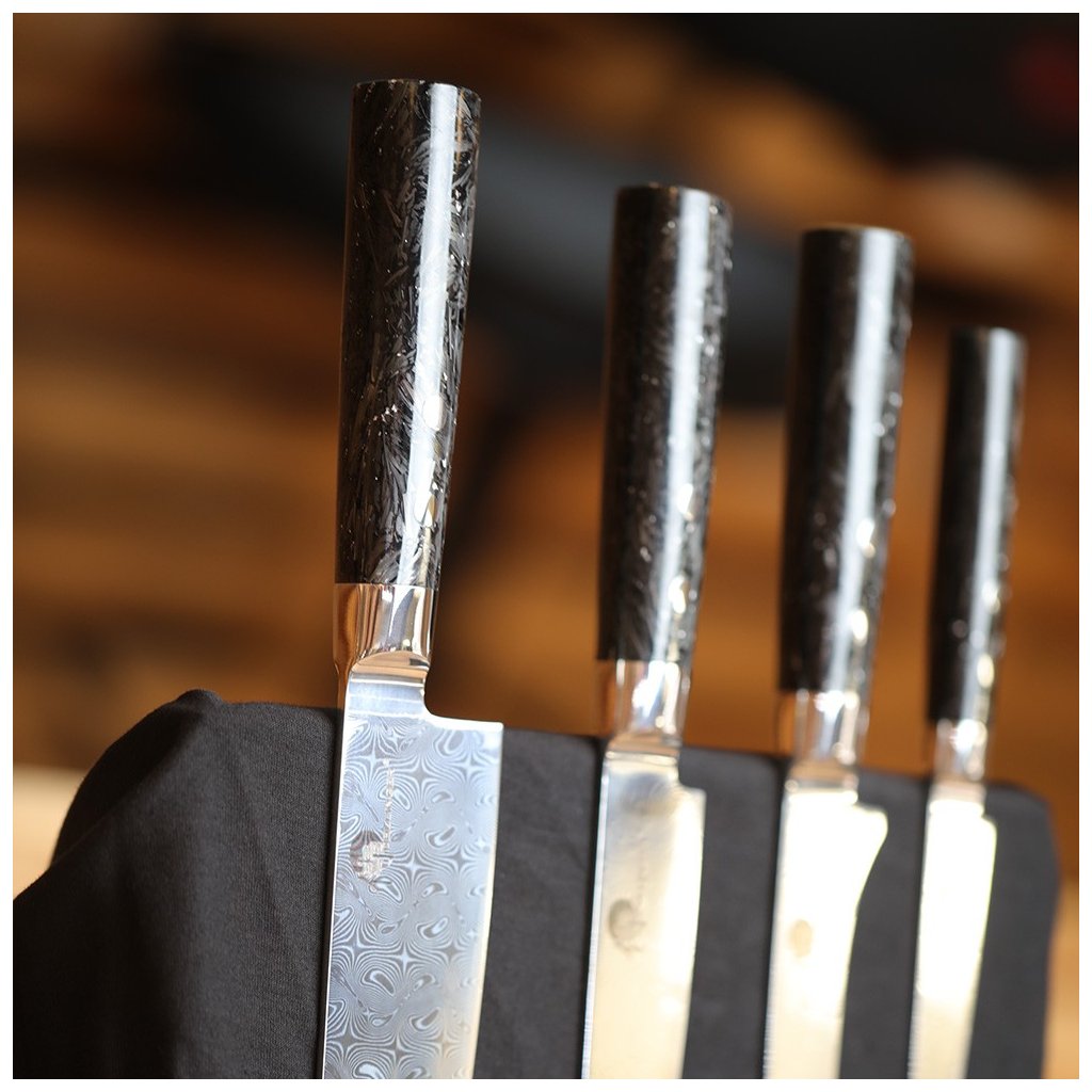 - die sorgfältig geschliffene Klinge ohne Kern besteht aus 110 Lagen zweier harter rostfreier und geschmiedeter Stähle und erreicht eine Härte von etwa 60 HRC