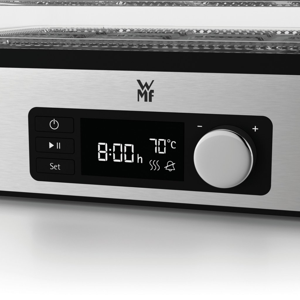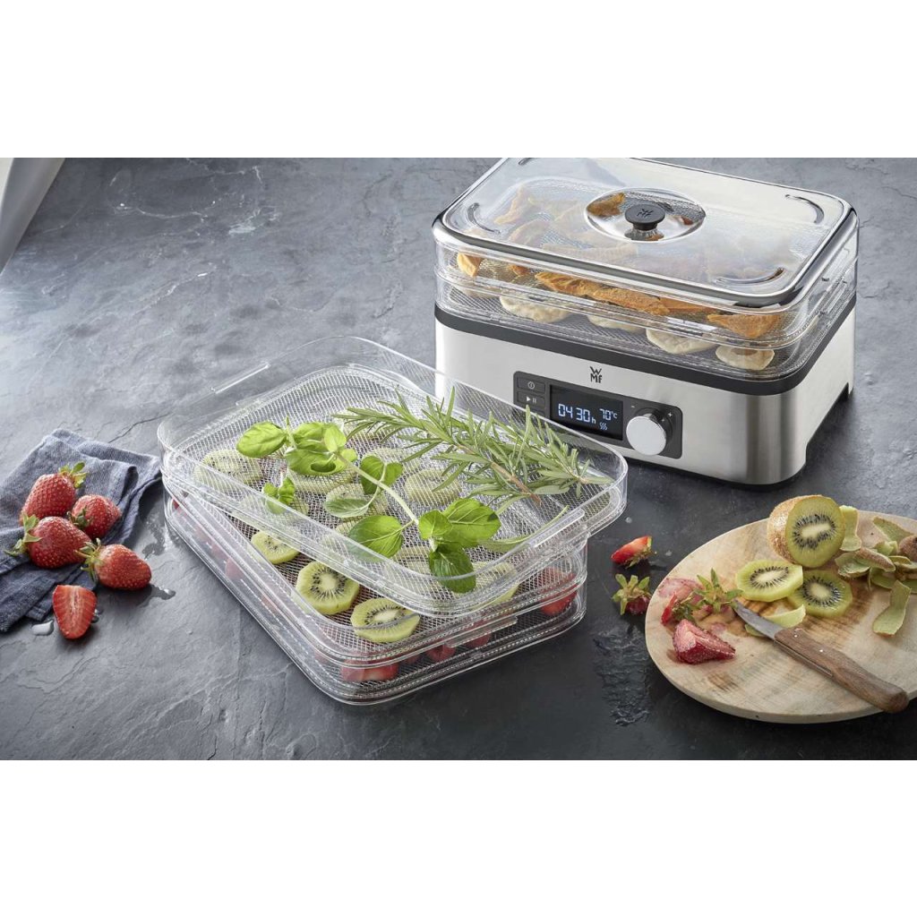 Mit dem Trockner aus der Kleingeräteserie KITCHENminis® der deutschen Marke WMF lassen sich Snacks und Trockenfrüchte ganz einfach zu Hause herstellen. 5 Etagen von Trockenblechen mit elektronischer Luftzirkulation trocknen effizient Fleisch, Obst, Gemüse, Pilze und Kräuter. Die Steuerung ist intuitiv. Das Gerät ist mit einer automatischen Abschaltfunktion ausgestattet, so dass Sie den Trockner über Nacht laufen lassen können. Zum Zubehör gehören auch eine Form für Obst- oder Müsliriegel und praktische Gläser für getrocknete Lebensmittel, einschließlich einer praktischen Reisetasche für die Riegel.