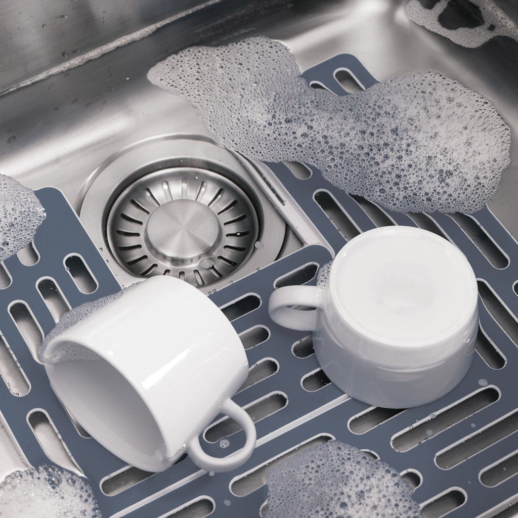Beim Spülen von empfindlichem Geschirr ist ein Spülbeckenschutz unerlässlich, um zu verhindern, dass das Geschirr mit dem harten Spülbecken kollidiert. Das clevere gummierte Sink Saver Pad besteht aus zwei Komponenten, die modular und passgenau zusammengesetzt werden können, so dass der Raum über dem Waschbeckenabfluss immer frei bleibt. Die rutschfesten Füße ermöglichen eine natürliche Wasserzirkulation, aber auch eine Luftzirkulation zwischen den Waschgängen.