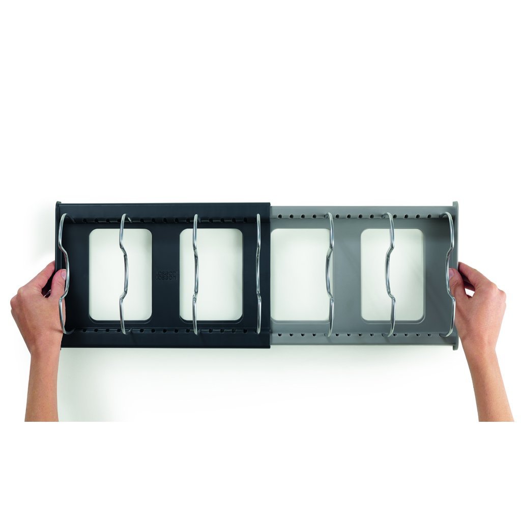 JOSEPH JOSEPH DrawerStore™ Expanding Cookware Organiser mit verstellbaren Abständen zwischen den Trennwänden - geeignet zur Aufbewahrung von Deckeln, Pfannen, Kasserollen, Backblechen. Einfacher Zugang zu den aufbewahrten Speisen. Verstellbare Bodenlänge von 30,6 bis 56 cm. 7 verstellbare Trennwände.