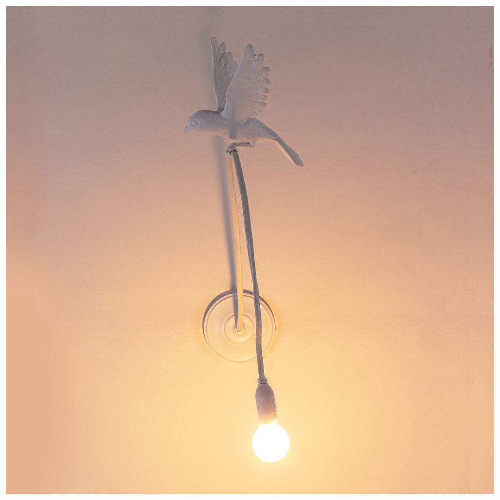 - design-Wandleuchte in Form eines kleinen Spatzen, der ein Kabel hält