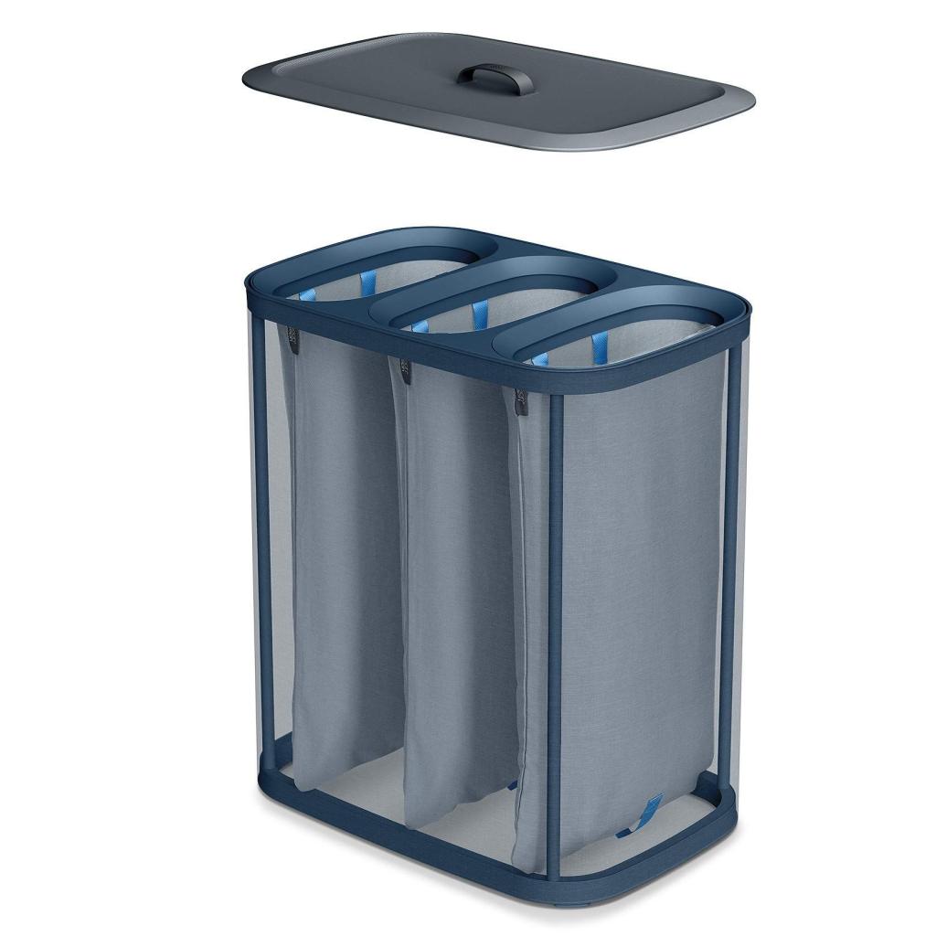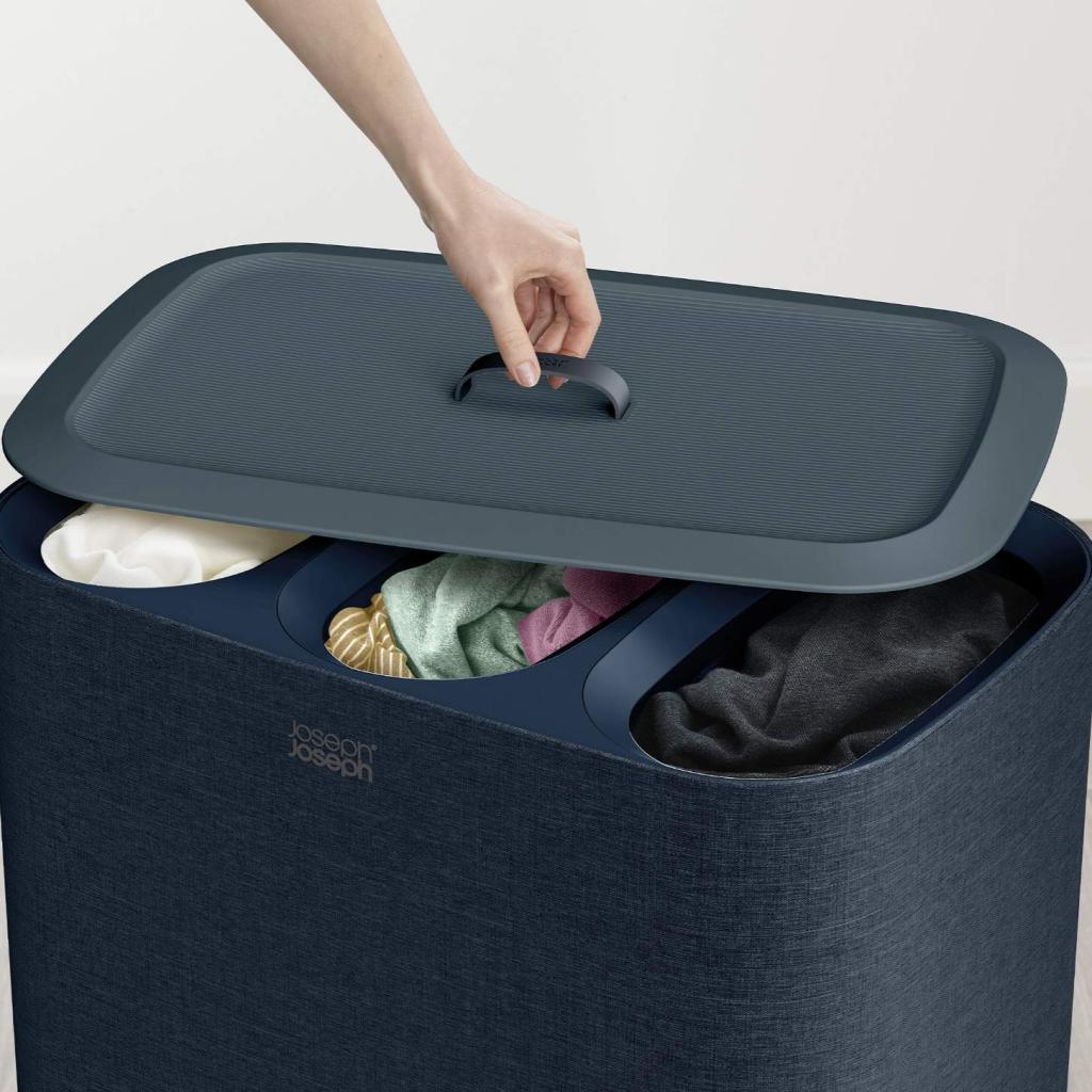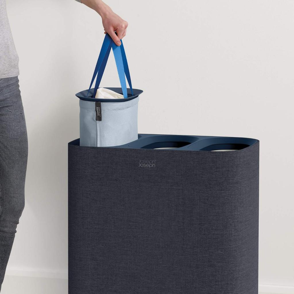 - Drei getrennte 30-Liter-Fächer erleichtern die Trennung von heller, dunkler und bunter Wäsche, sobald sie weggelegt wird.
