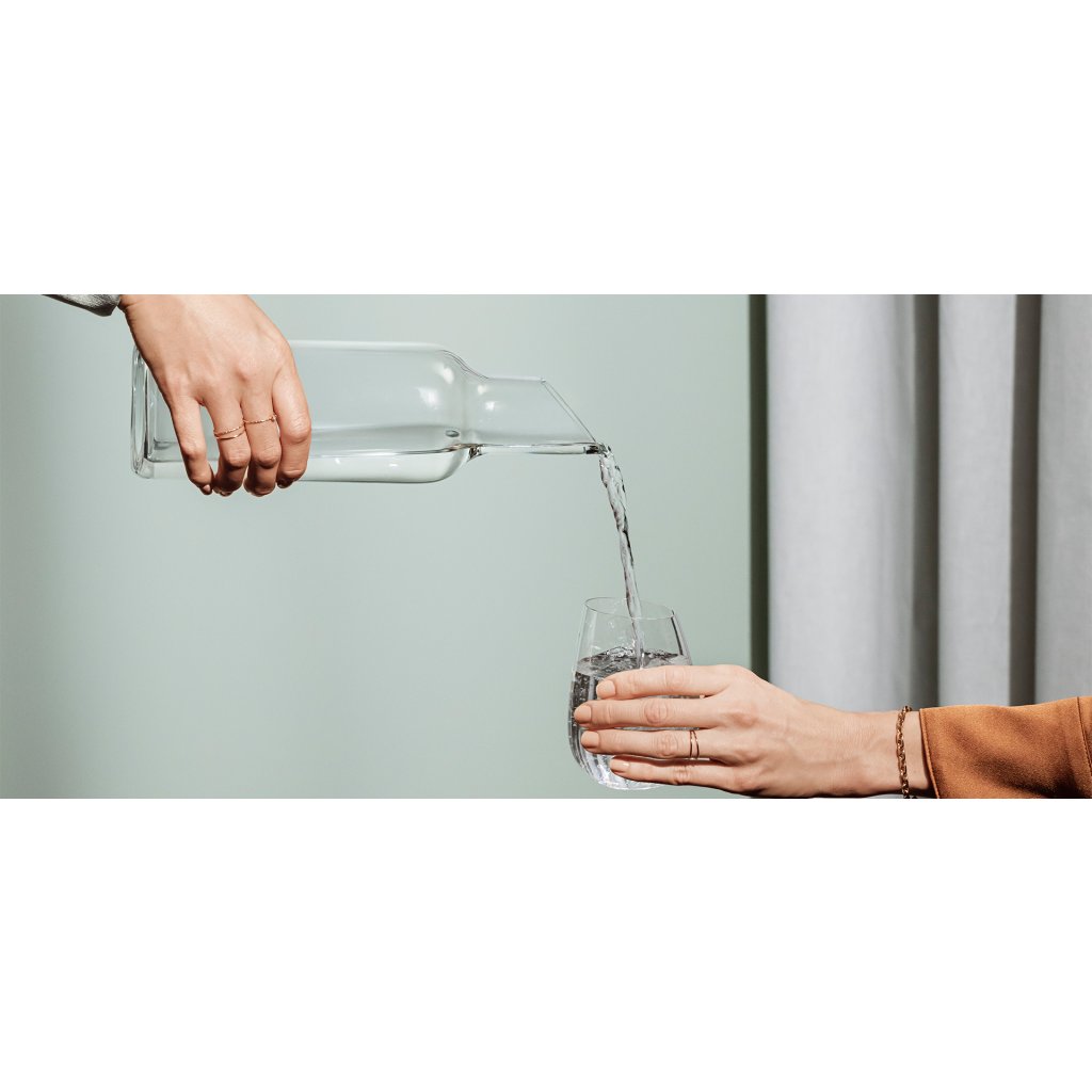 Verleihen Sie Ihrem Tisch einen Hauch von nordischem Stil mit dieser eleganten Glaskaraffe, die perfekt in die Tür eines jeden Kühlschranks passt. Der praktische Eichenholzstopfen sorgt dafür, dass das Wasser keine Gerüche von anderen Lebensmitteln im Kühlschrank aufnimmt. Die 1-Liter-Design-Karaffe ist aus hochwertigem Glas gefertigt.