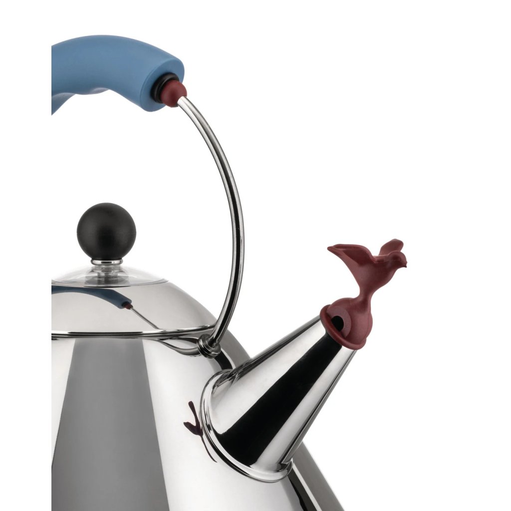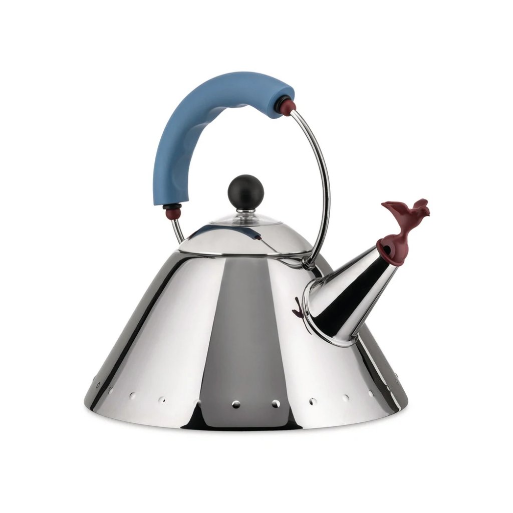 Die Teekanne 9093 aus hochwertigem Edelstahl stellt die Ikone des modernen Industriedesigns und zugleich eines der bekanntesten Produkte der Marke Alessi dar, das in der Geschichte des Unternehmens am meisten verkauft wurde. Der Designer Michael Graves ebnete im Jahr 1985 den Weg für verspieltes Design, das in den 1990er Jahren zu einem Trend wurde. Die Teekanne ist mit einem Griff und einer Pfeife aus thermoplastischem Harz ausgestattet und eignet sich für alle Wärmequellen einschließlich Induktion.
