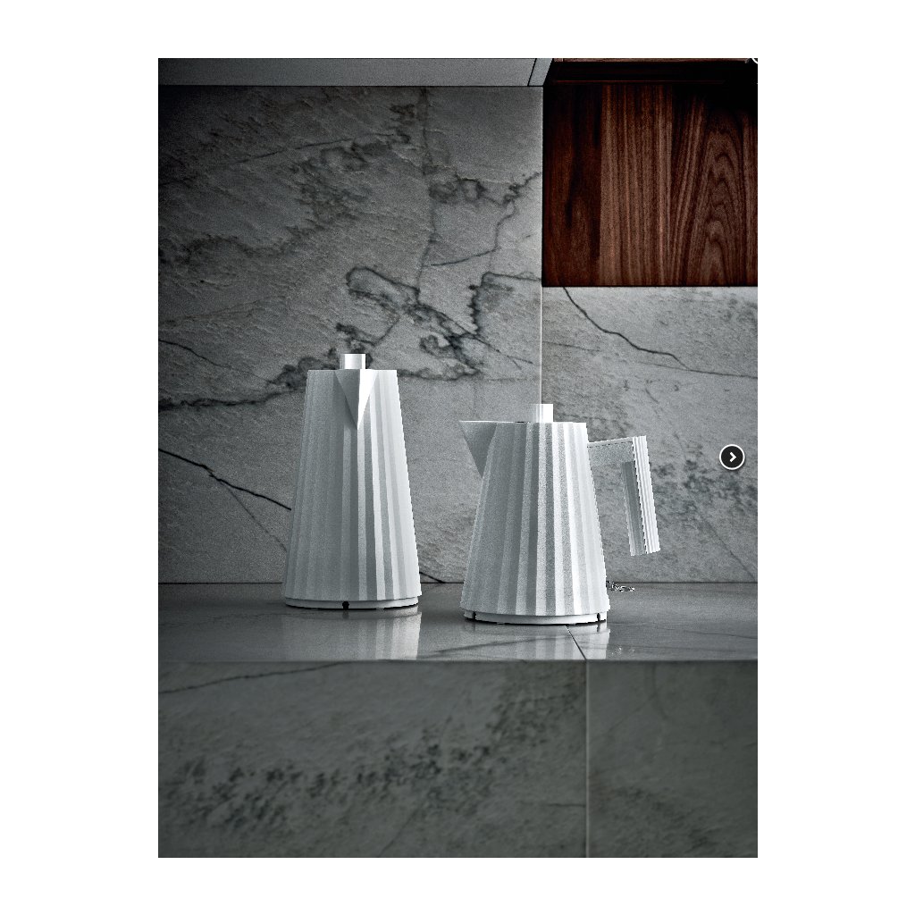 Elektrischer Wasserkocher Plissé von den italienischen Designern der Marke Alessi, der dank seiner Oberfläche auf den ersten Blick ins Auge fällt. Der wärmeisolierte Wasserkocher verfügt über einen versteckten Stromanschluss, eine einstellbare Kabellänge, ein Sicherheitsmechanismus und Platz für eine praktische Kabelaufwicklung.