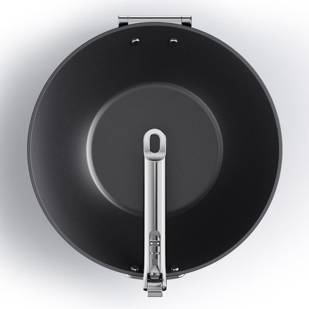 - Dank des Klappmechanismus lässt sich der Griff leicht in den Wokkörper einklappen und spart so bis zu fünfzig Prozent Platz im Vergleich zu herkömmlichem Kochgeschirr.