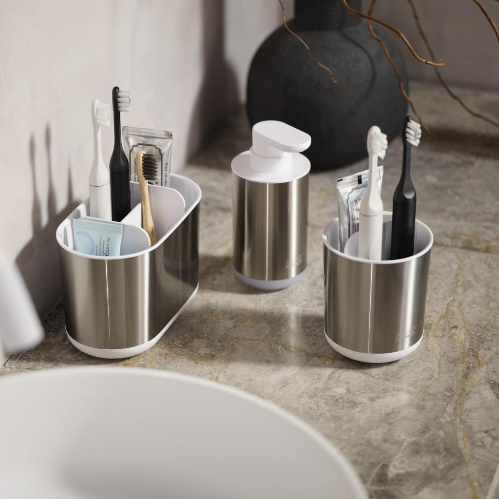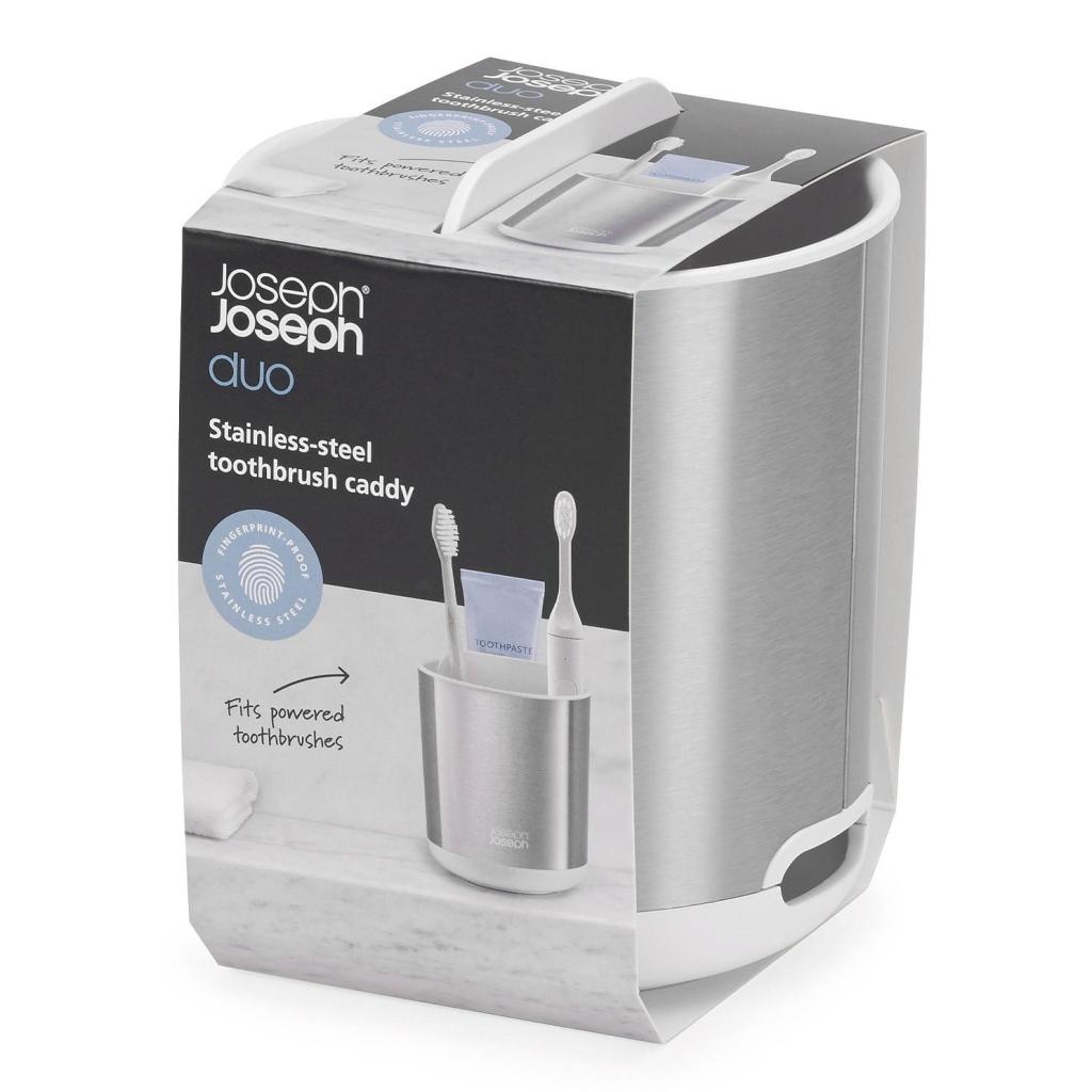 - Der Zahnbürstenständer Joseph Joseph DUO STEEL in kompakter Bauweise kombiniert ein elegantes Edelstahlgehäuse mit einer praktischen weißen Inneneinteilung.